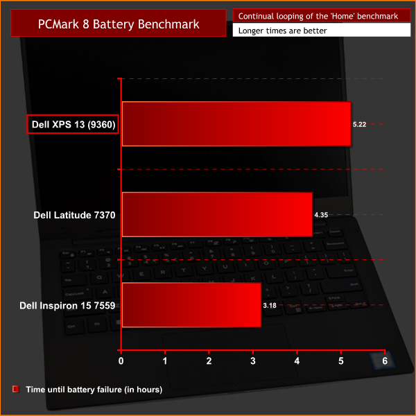 5:22 is a great score here. Given that the battery benchmark is a relentless assault on any laptop, we can expect real-world performance to be around double the benchmark result. As such, the XPS 13 should easily last a full day at the office, making it a great option if you are looking for a long-lasting productivity machine.