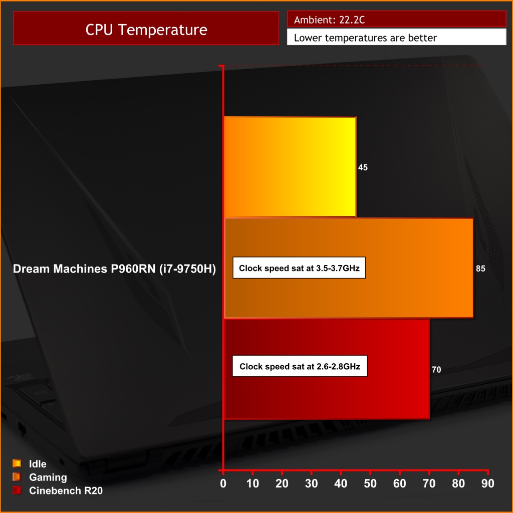 Starting with our look at CPU thermals, as we mentioned on the previous page clock speed scales back quite significantly during a run of Cinebench R20. The reported figure of 70C is indicative of what we saw once the clocks had settled around 2.6-2.8GHz, but at the start of the test – with some cores running as fast as 4GHz before slowing – certain cores did hit 99C before the frequency scaled back.