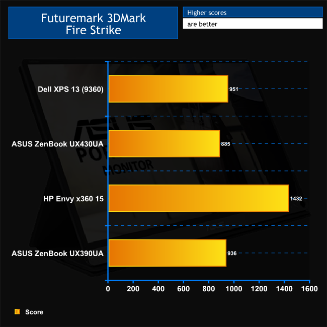 Not a particularly outstanding result in 3DMark's Fire Strike for the UX430UA. It comes last behind the Dell XPS 13 and (surprisingly) the UX390UA, although only by a few per cent that you're unlikely to notice in the real world.