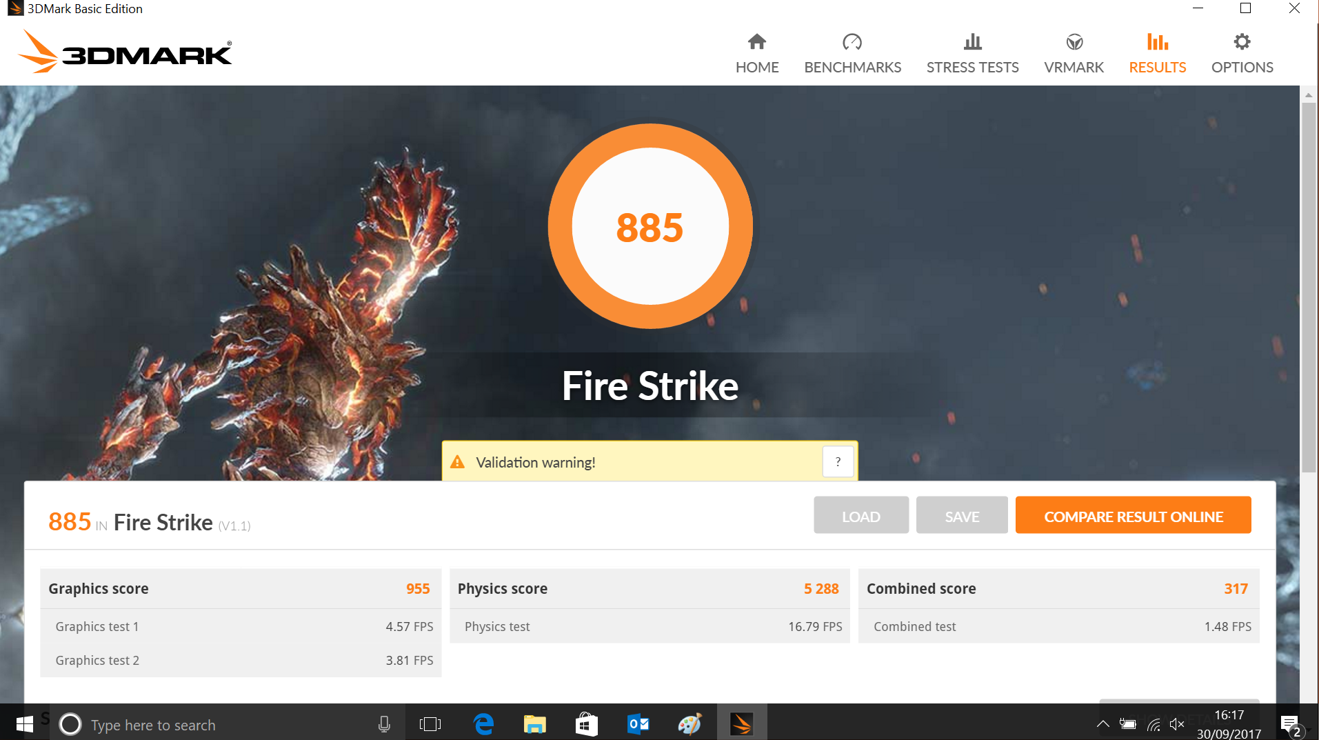 To test the integrated Intel HD Graphics 620, we ran Futuremark's 3DMark Fire Strike. Note that the score shown below is the Overall result.