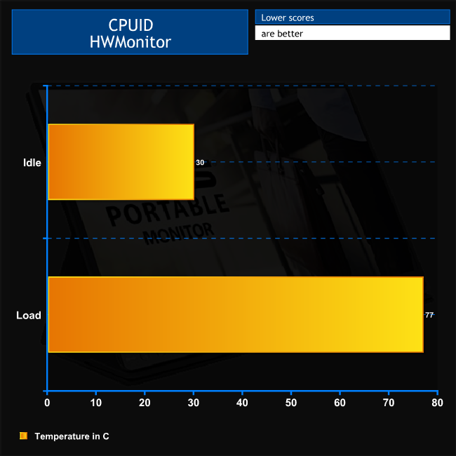 The UX430UA runs pretty cool when idle, at only 30C, whilst 77C when under heavy load isn't anything to be concerned with either.