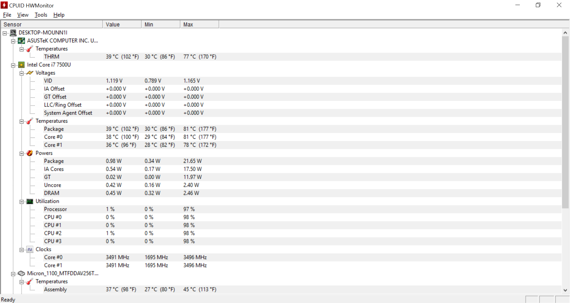 To find the UX430UA's idle temperature, we left Windows on the desktop for 30 minutes. The ‘load’ temperature reading comes from running 3DMark Fire Strike.