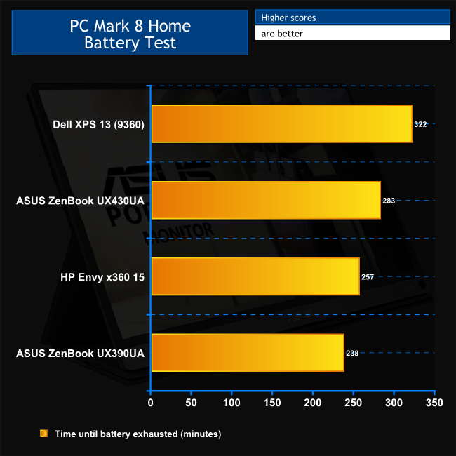 The ZenBook UX430UA's overall battery life is a distinct improvement over the UX390UA, offering a useful 45 more minutes and falling just 17 minutes shy of five ours. This is still 39 minutes behind the Dell XPS 13, but in everyday use, which probably won't be as intensive as this test, you should be able to get a full seven-hour working day from the UX430UA on one charge, or more.
