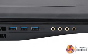Such a huge laptop has plenty of space for ports, and MSI has taken full advantage of the possibilities. On the left we find three USB 3.0 ports and a quartet of audio mini-jacks. The latter provides line in and out, microphone, and a headphone connection that doubles as S/PDIF.