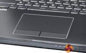 The large chassis means plenty of room for a full-sized keyboard with discrete numeric keypad on the right. The action of the chiclet-style keys is comfortable, and there's loads of space for resting your wrists as you type. The keys sport a blue backlit by default, as does the large trackpad. This has discrete buttons, and is placed directly below the spacebar, minimising the chance of accidental pointer movement caused by the heels of your hands brushing it as you type.