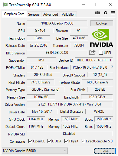 The only graphics available therefore is the mobile NVIDIA Quadro P5000. This has the same 2,048 CUDA cores as the desktop version, and the same 16GB of GDDR5 memory. However, the core speed is considerably slower – 1,164MHz versus 1,607MHz for the desktop version, and with a 1,506MHz Boost versus 1,733MHz.