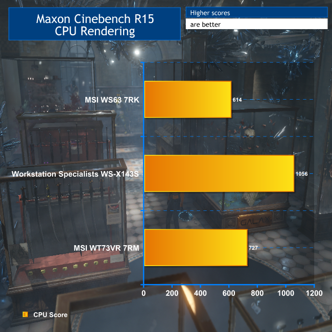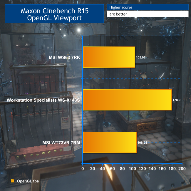 The Cinebench OpenGL test is very sensitive to clock speed, so neither of the notebooks fare well against a desktop running at 5GHz. The WT73VR 7RM is only marginally better than its lighter, cheaper, and less powerful WS63 7RK sibling.