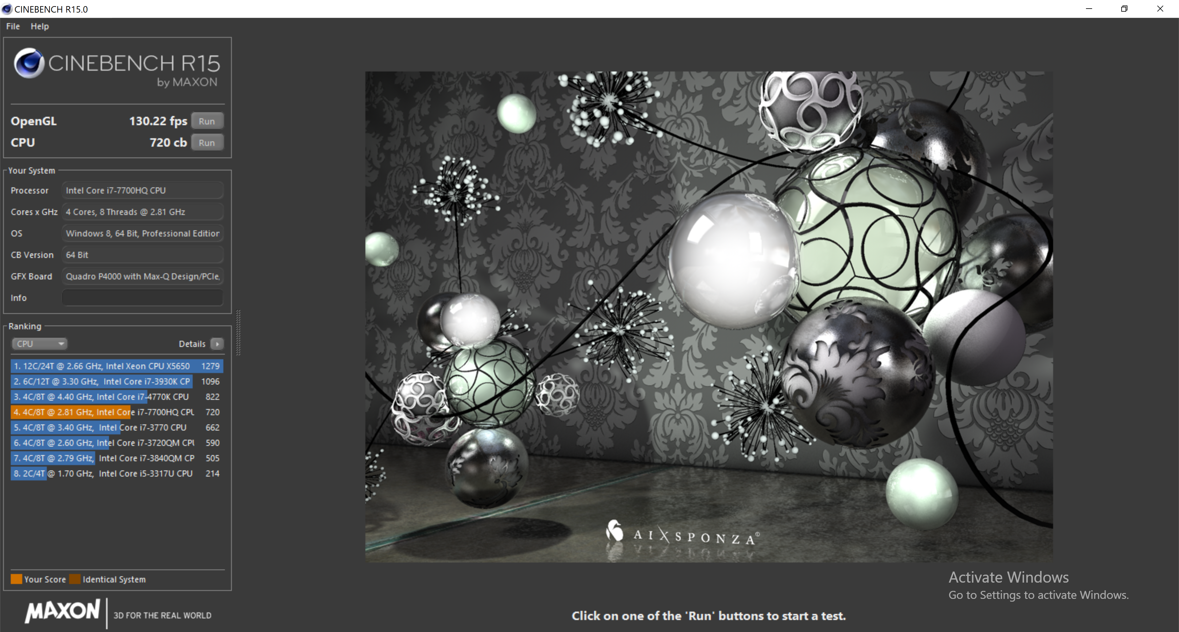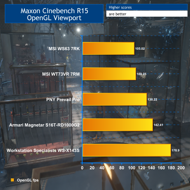 For this test, we only compared the Armari workstation with a desktop Quadro P4000 installed. The Maxon Cinebench OpenGL test is very sensitive to CPU clock speed, and the Workstation Specialists WS-X143S was running at 5GHz, so easily aced this test.