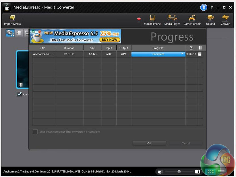 For this test, a 3.8GB MKV file was converted to a much larger MP4 file. The time it took to complete this task was noted down.