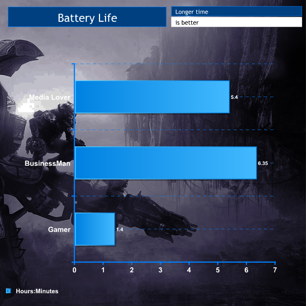 Bad battery life is good, especially when viewing media, being able to watch three and a bit full length movies on one charge. Gaming suffers a bit, but an hour forty isn't bad for a laptop that's not focused for the task. Also, the game of choice was Titanfall, which would have pushed this laptop to its limit. With less strenuous games, you might have better results.