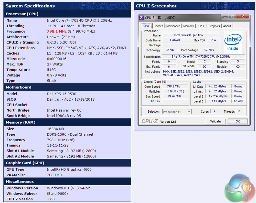 There's a few different hardware options with the XPS 15 9530 (see first page of this review), but this particular version comes with the 4th generation Intel i7-4702HQ CPU with 6MB of l3 cache. Its default clock speed is 2.2GHz, but this can be boosted up to 3.2GHz.