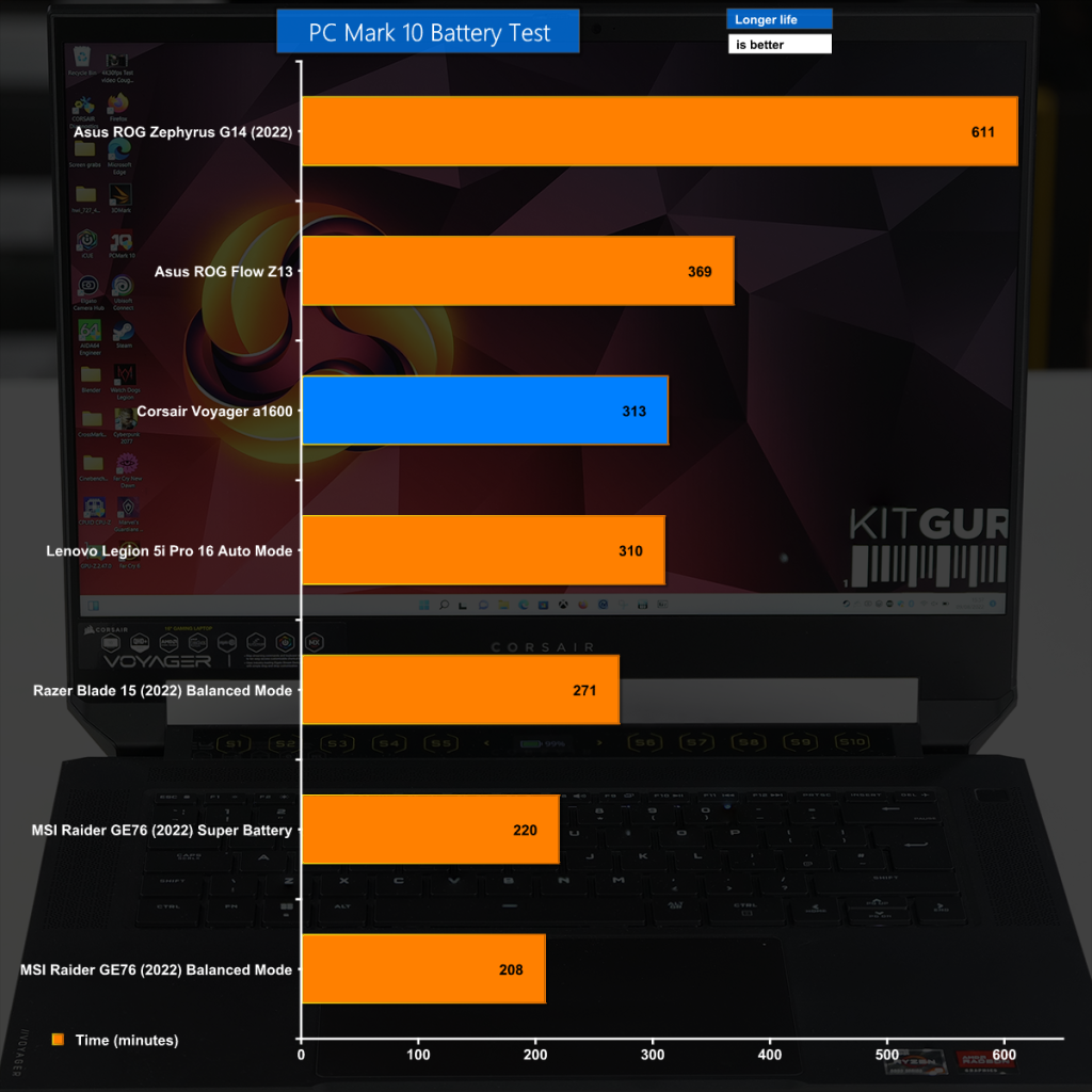 The PC Mark 10 battery test is something of a concern. AMD hardware majors on efficiency, as we see with the Asus ROG Zephyrus G14, however the battery performance of the Corsair a1600 is nothing special. We have to hope that updates to the BIOS and system software bring improvements in the future.