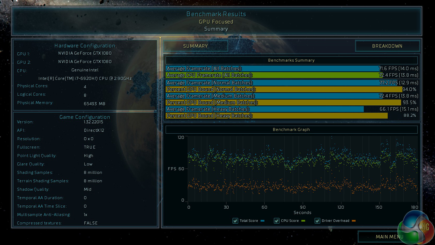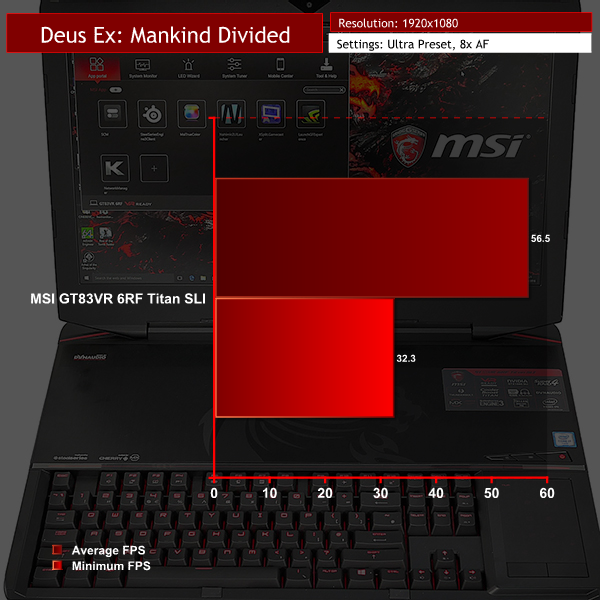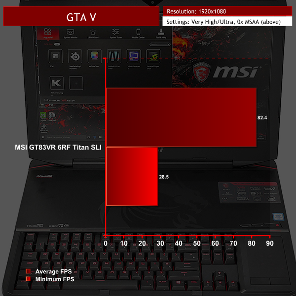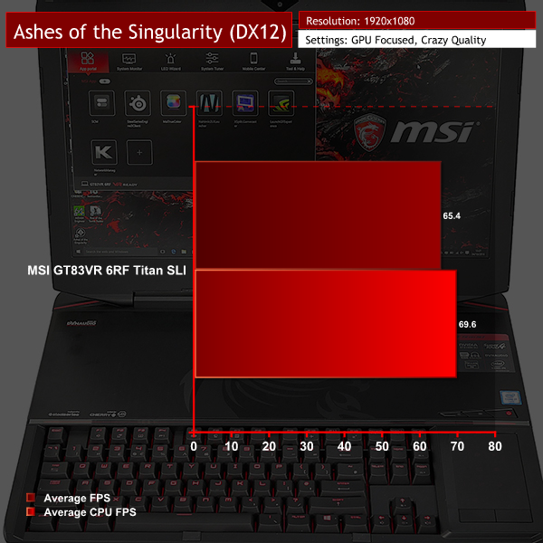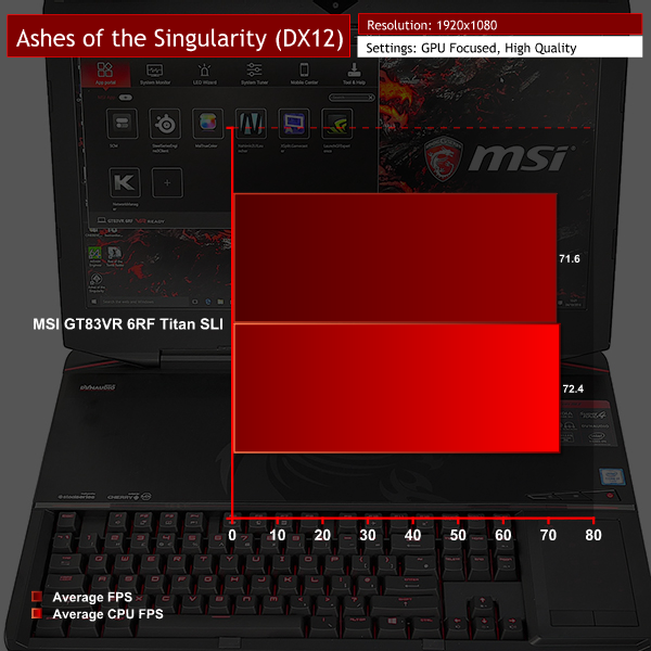Editorial note: We spent extra time examining the performance of GTA V and Ashes of the Singularity (High preset), as we noticed that the frame rates delivered by the dual GTX 1080-powered GT83VR 6RF Titan SLI were very similar to a single GTX 1070-powered MSI laptop, and also the dual GTX 1080-powered Asus GX800VH with its 4K resolution. The results were consistent and correct.