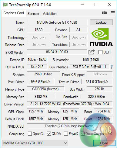 The clock figures for the GTX 1080s are a base speed 1557MHz, boost 1734MHz and memory 1251MHz.