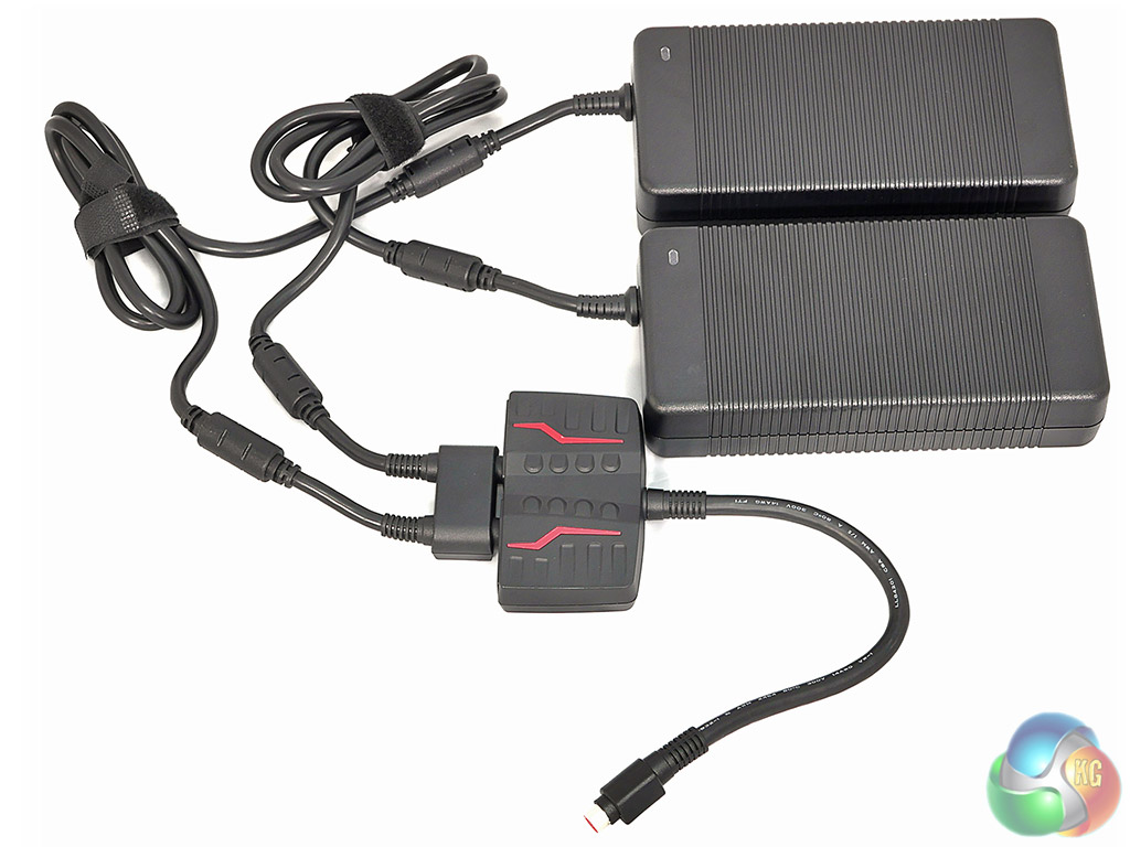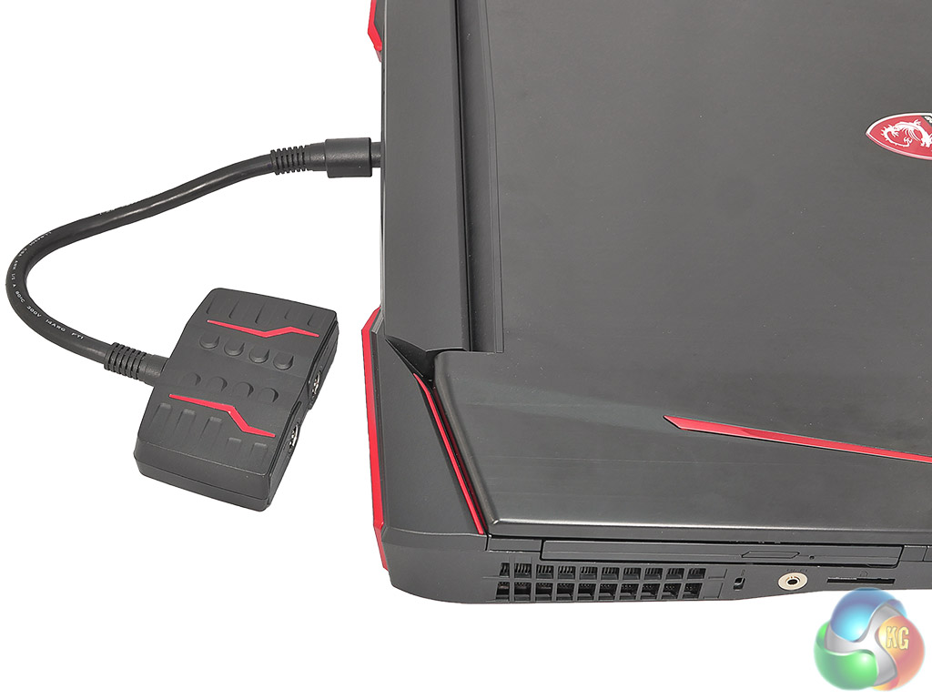 Connecting the new Titan to mains power is a novel experience as the two hefty power bricks are linked together at the output end and then connect to a Y-piece which in turn plugs into the laptop. The socket on the end of the cable does not lock into the laptop, so you need to arrange the hardware carefully on the table to ensure the cable doesn’t fall out while you are gaming.