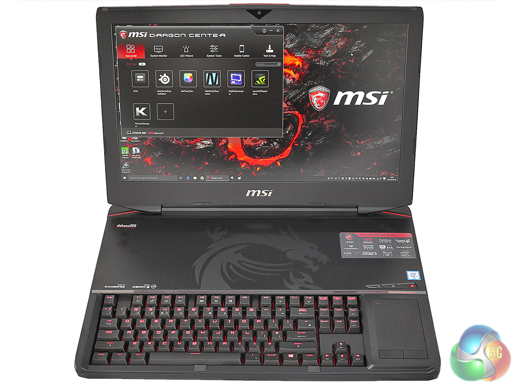 By contrast, turning Titan on is entirely familiar; press the power button, admire the red LEDs in the mechanical keyboard and wait for a massive array of software to fill the system tray. MSI is justifiably proud of its relationship with a number of partners (Intel, Nvidia, SteelSeries, Killer, Nahimic and Xsplit to name but a few) and every last one of them seems to pack in some software. Added to that, you have MSI’s own Dragon Centre utility and we recall uninstalling Norton as the very first task after the laptop arrived.