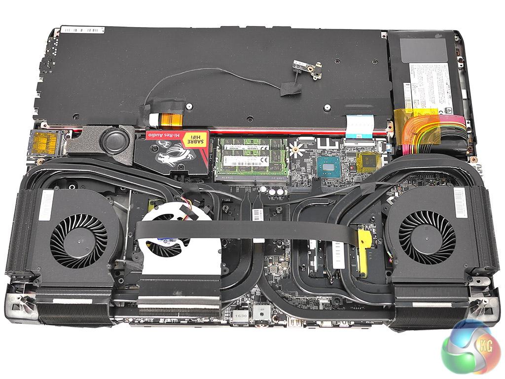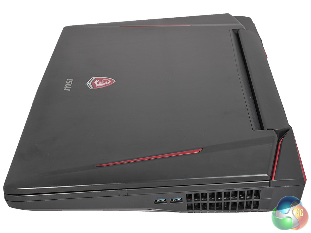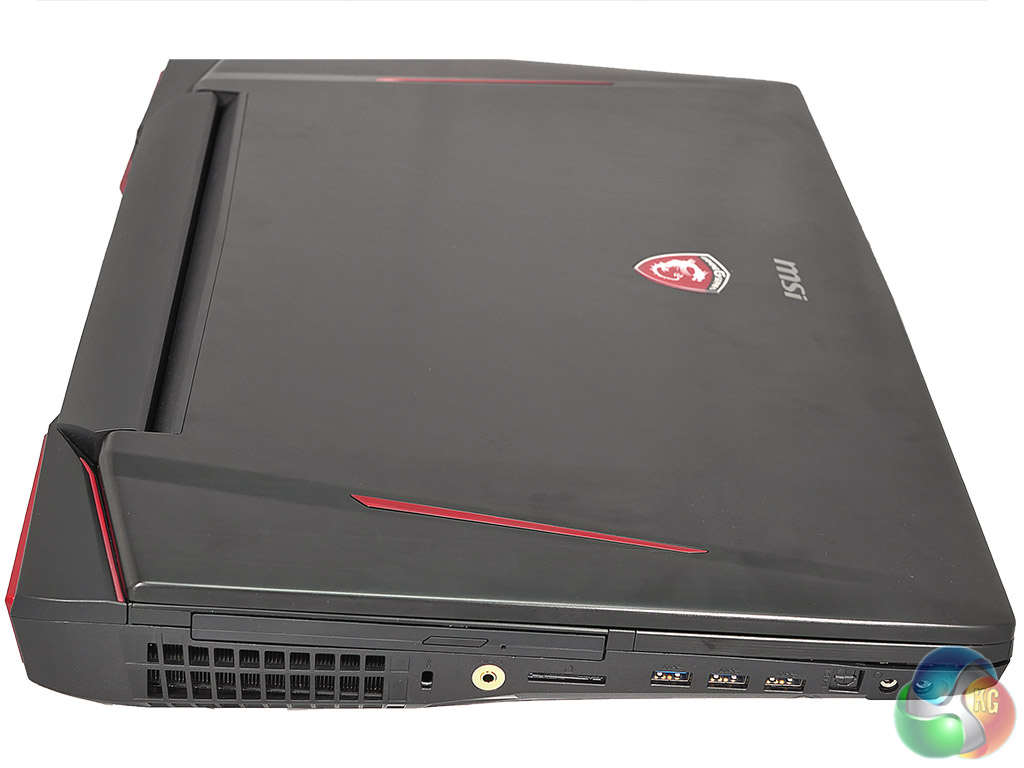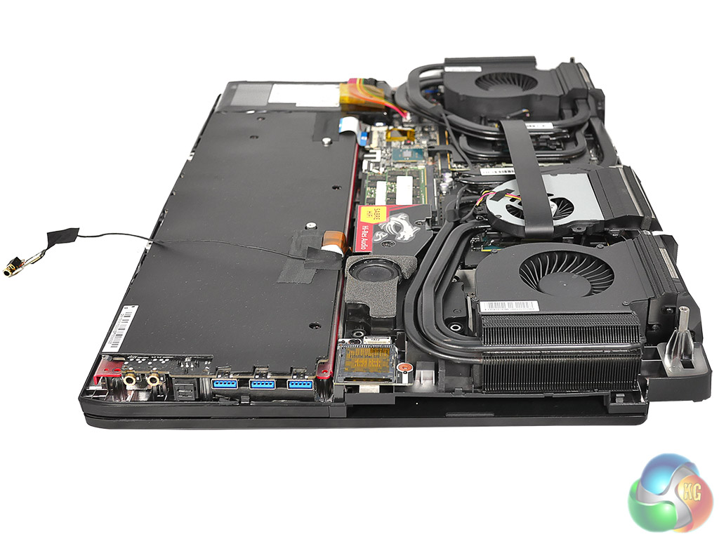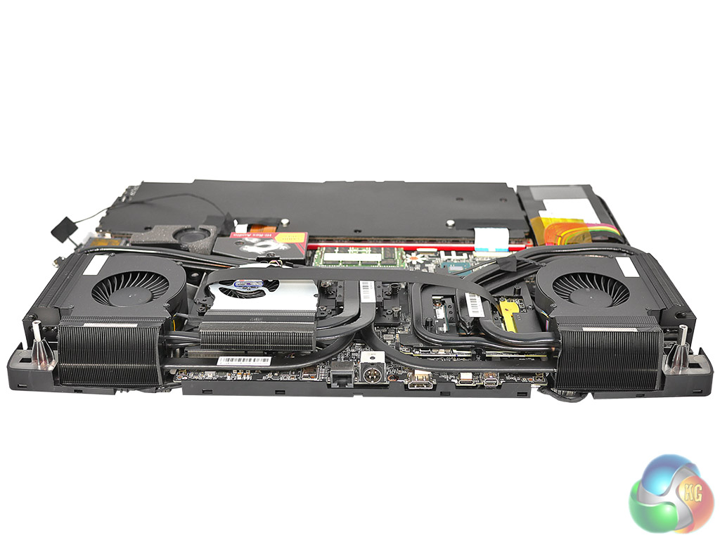 You may be wondering why Titan is so large and a quick look at our photos and video will show you there are two halves to the answer. The first part is that the mechanical keyboard with its Cherry switches takes up a significant part of the chassis. The second thing is how much space is required by the cooling system. It looks slightly more extensive than the GT80S cooling system as MSI has added a small helper fan near the CPU, but most of the cooling is handled by two enormous turbines in the rear corners of the chassis. These draw air from the centre and expel it to the side and rear through those enormous vents.