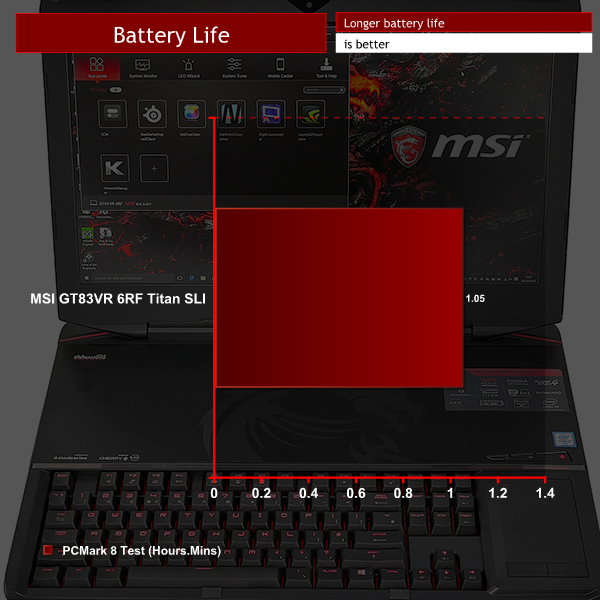 Battery life for the Titan is a little over 1 hour according to the PCMark 8 test. That should translate into about 2 hours of usable battery life for real-world tasks.