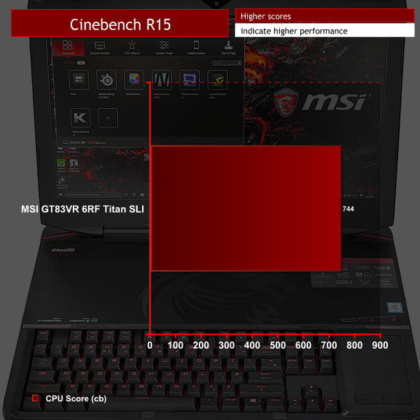 The Cinebench score of 744 is respectable for the Titan's Core i7 6920HQ processor. But it isn't as fast as the 800+ points put up by the overclocked 6820HK in the Asus GX800.