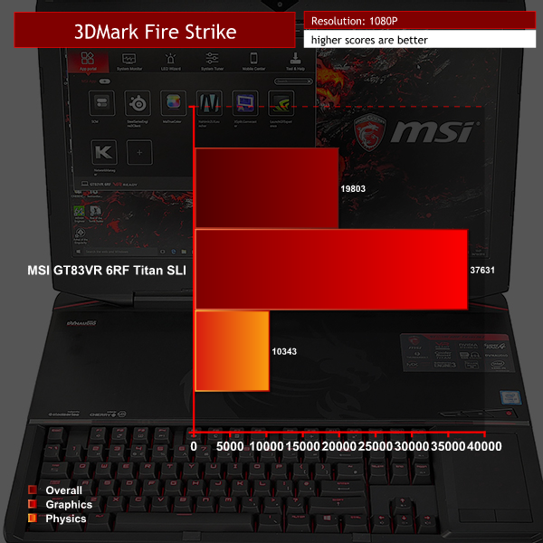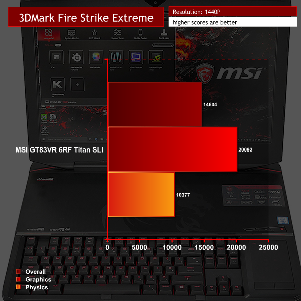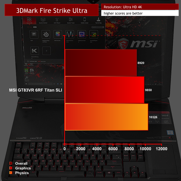 We tested the new Titan using the Full HD screen, rather than an external display and it was excellent. If you want to know how dual GTX 1080s perform at 4K we have figures from our review of the water cooled Asus GX800VH review. In essence, Titan GT83VR 6RF and GX800VH have performance that is identical.