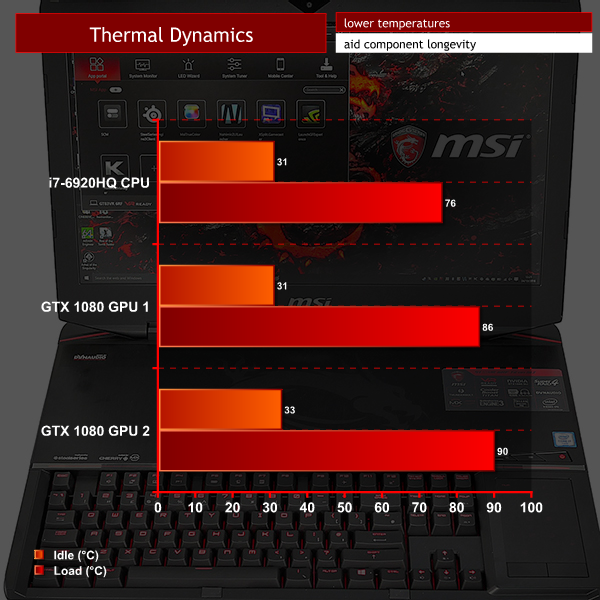 The downside to the epic graphics performance and huge power draw is that Titan has to work hard to keep the GPUs sufficiently cool. The previous GT80S Titan with GTX 980s ran the GPUs around 70 degrees. In the case of Titan GT83VR the GPUs sat at 86 and 90 degrees.