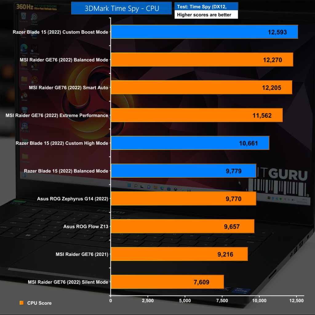 The CPU element of 3D Mark Time Spy is interesting as it allows the Razer Blade to stretch its legs. We do not understand how it manages to beat the faster MSI Raider but score one for Razer.