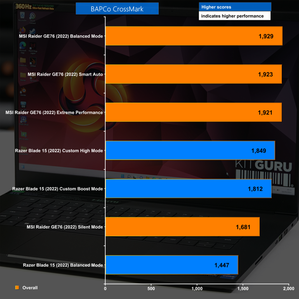 BAPCo CrossMark tests the whole system and we can see the impact of restricting power to both the CPU and the GPU as the results are fairly dire for the new Blade.