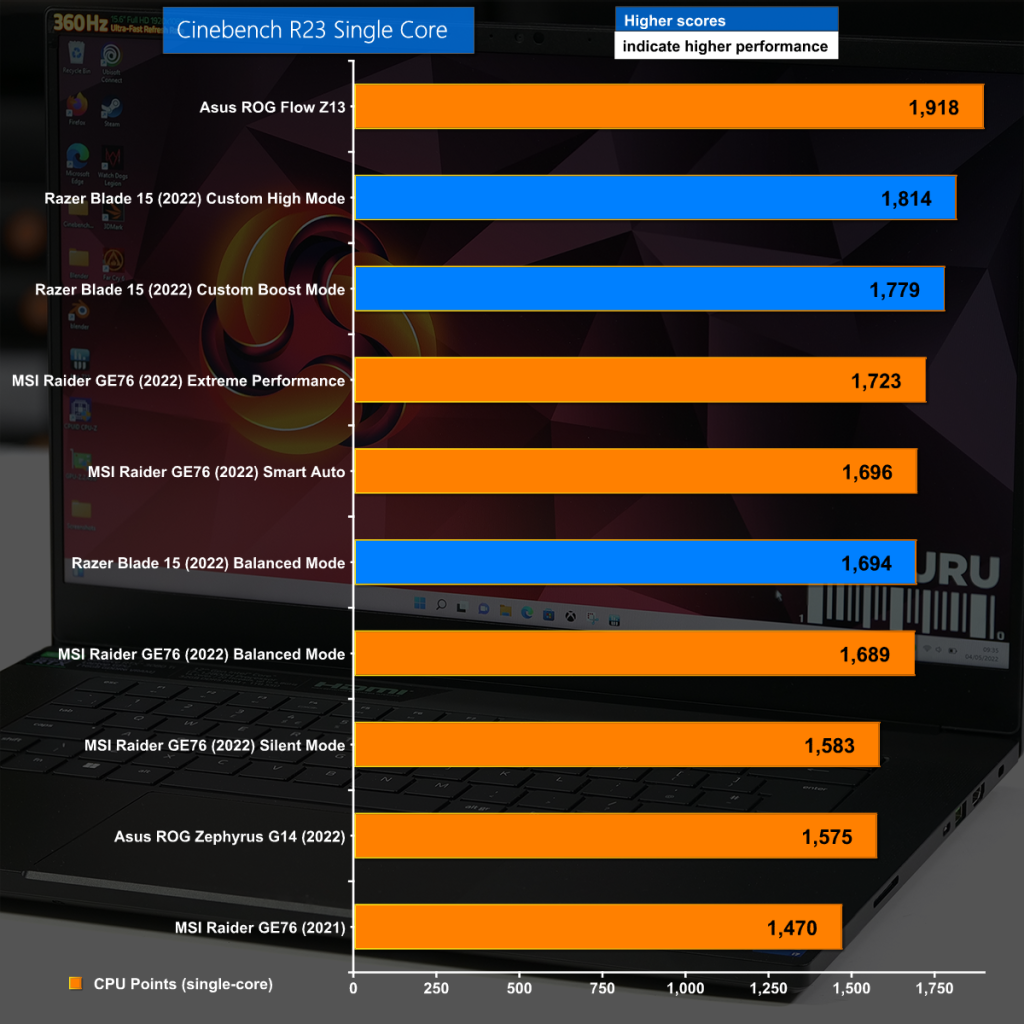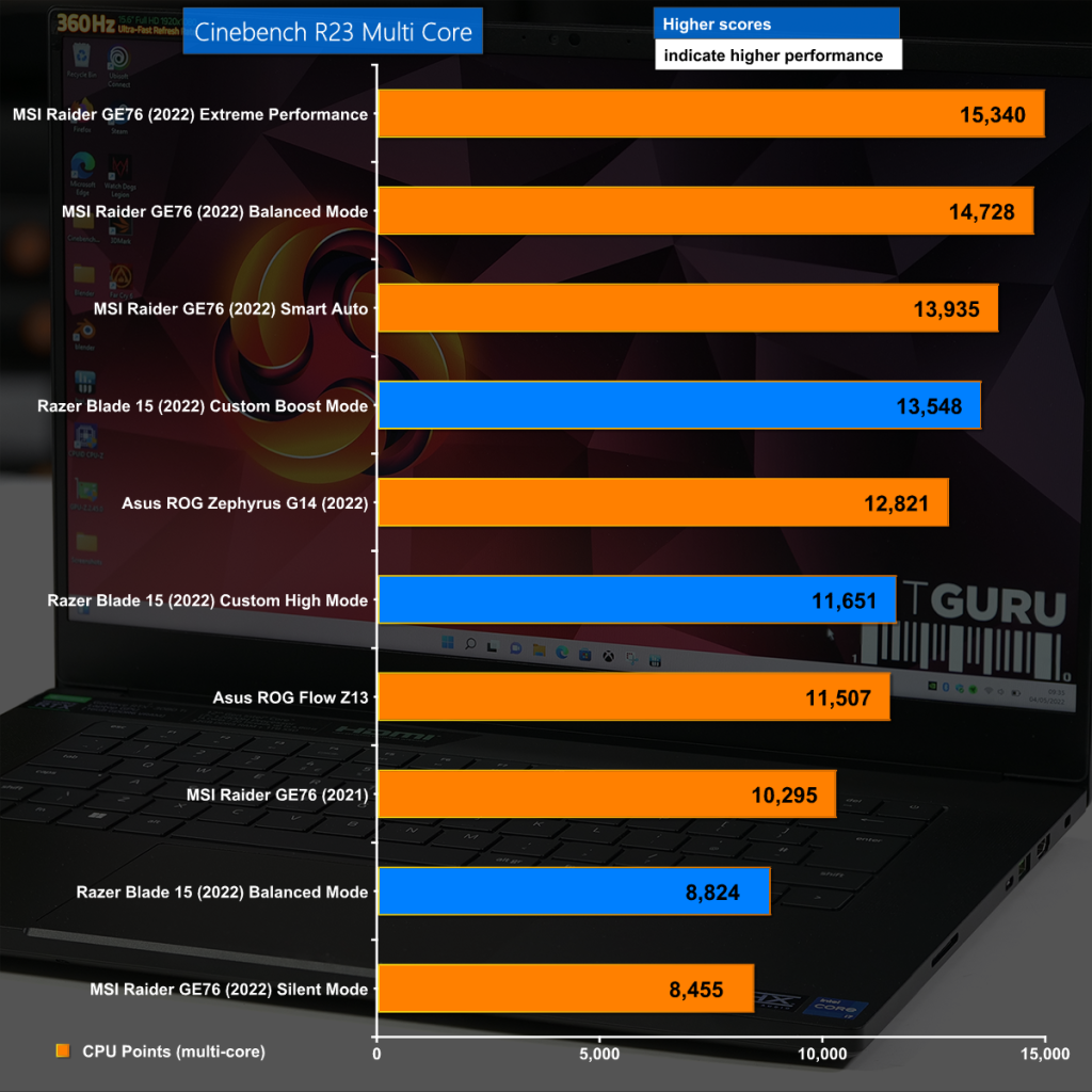 In the Multi Core test of Cinebench R23 the Razer Blade does a reasonable job, provided you give it enough power to work correctly, however it is trounced by the competition.