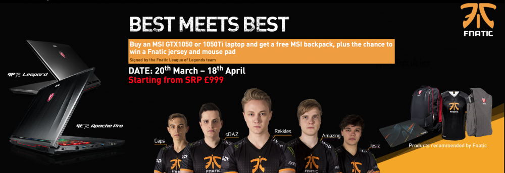 Those buying a qualifying laptop from a participating retailer will be entered for a chance to win a Fnatic jersey and mouse mat signed by the Fnatic League of Legends team. In order to enter the competition, you will need to register your laptop purchase with MSI.