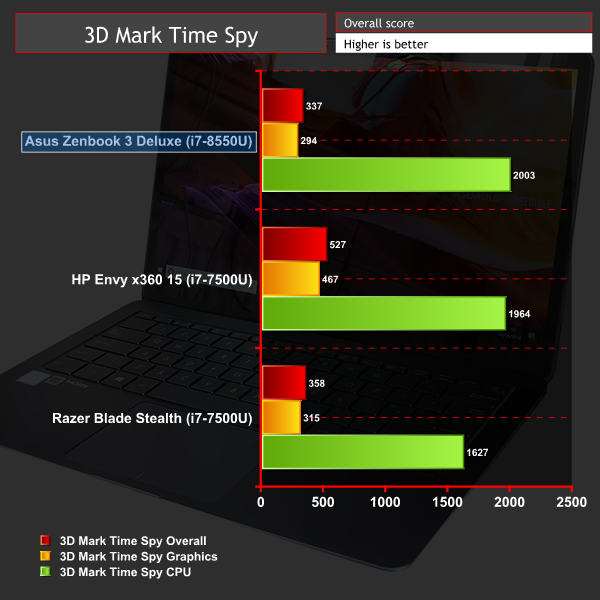 For this test, we ran the Asus Zenbook 3 Deluxe through 3D Mark Time Spy. We have listed results for the overall score, the CPU only score and the GPU-only score.