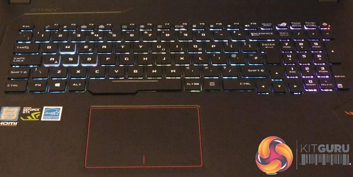 As you would expect given the ROG Strix GL753VD’s price point, the keyboard is not mechanical; rather it’s a membrane-based chiclet affair. Key-spacing is generally good; however, we did occasionally hit the up-cursor key instead of right shift, as it doesn’t extend all the way under the Enter key – which itself is a tad on the narrow side.