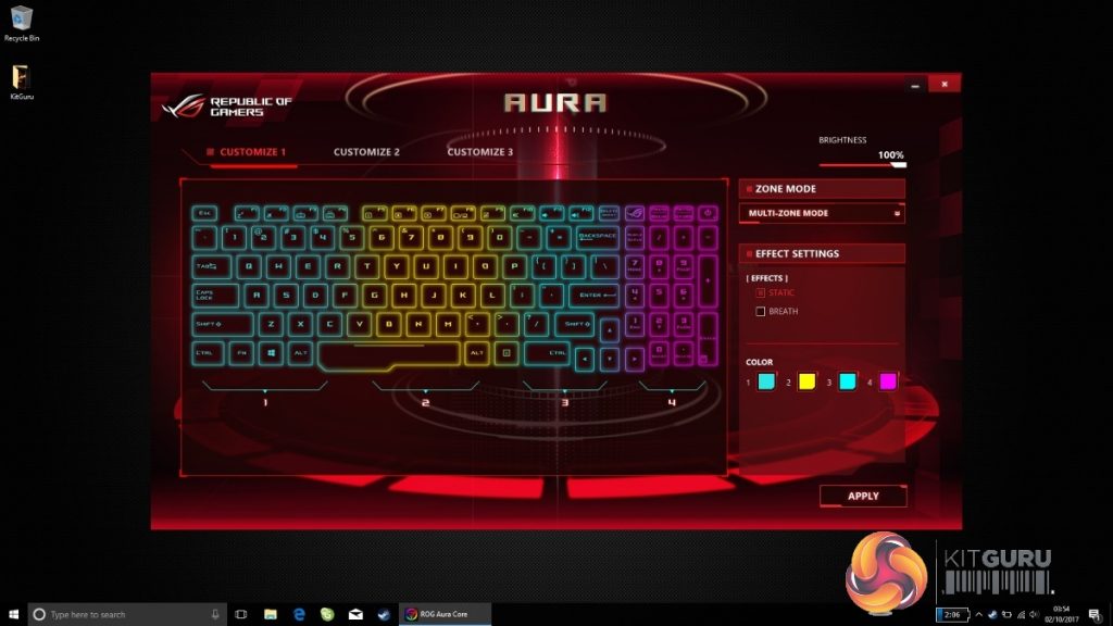 It’s also very easy to set up, thanks to Asus’ ROG Aura Core app. Here you can decide the colour of the backlighting (any colour you like), split the keyboard into four colour zones which can each have their own tint, and even add timing effects such as “breath” (which pulses the backlighting in a slow, medium or fast tempo). In a nice touch, the sides of the WASD keys are transparent, giving them that bit of extra illumination compared to their brethren.