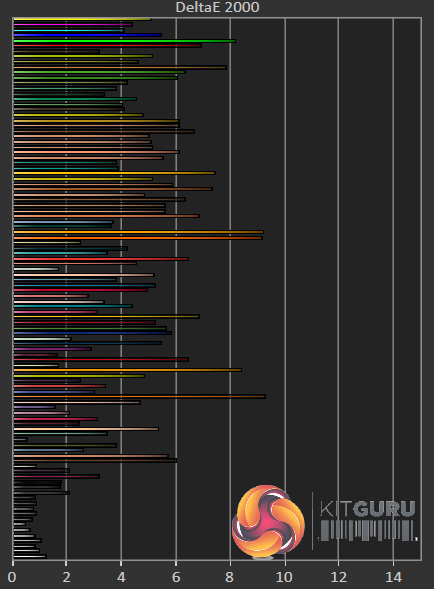 Colour accuracy was quite impressive according to dE76, with an average of 0.09 and maximum deviation of only 2.19 (lower is better); unfortunately it proved less so using the more accurate dE2000, where the GL753VD achieved an average of 4.2 and dE9.3 maximum. These figures are not great, but do keep in mind that the older standard is often used when comparing to rival displays.