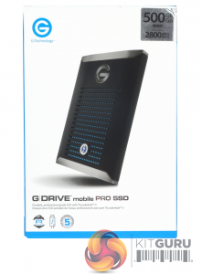G-Technology's G-Drive mobile Pro SSD comes in a stout box with a good clear image of the drive on the front. To the top right of the image is a sticker indicating the drive's capacity. Under the image are three icons that show that the drive is part of G-Technology's rugged R-series, the fact it has a Thunderbolt 3 interface and that it comes with a 5-year warranty.