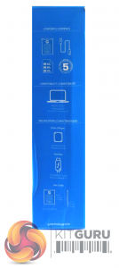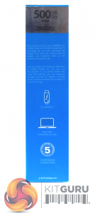 One side of the box carries a capacity sticker at the top along with logos for Thunderbolt3, Mac ready capability and another reminder of the 5-year warranty. The other side has yet more icons displaying box contents, compatibility and specifications.