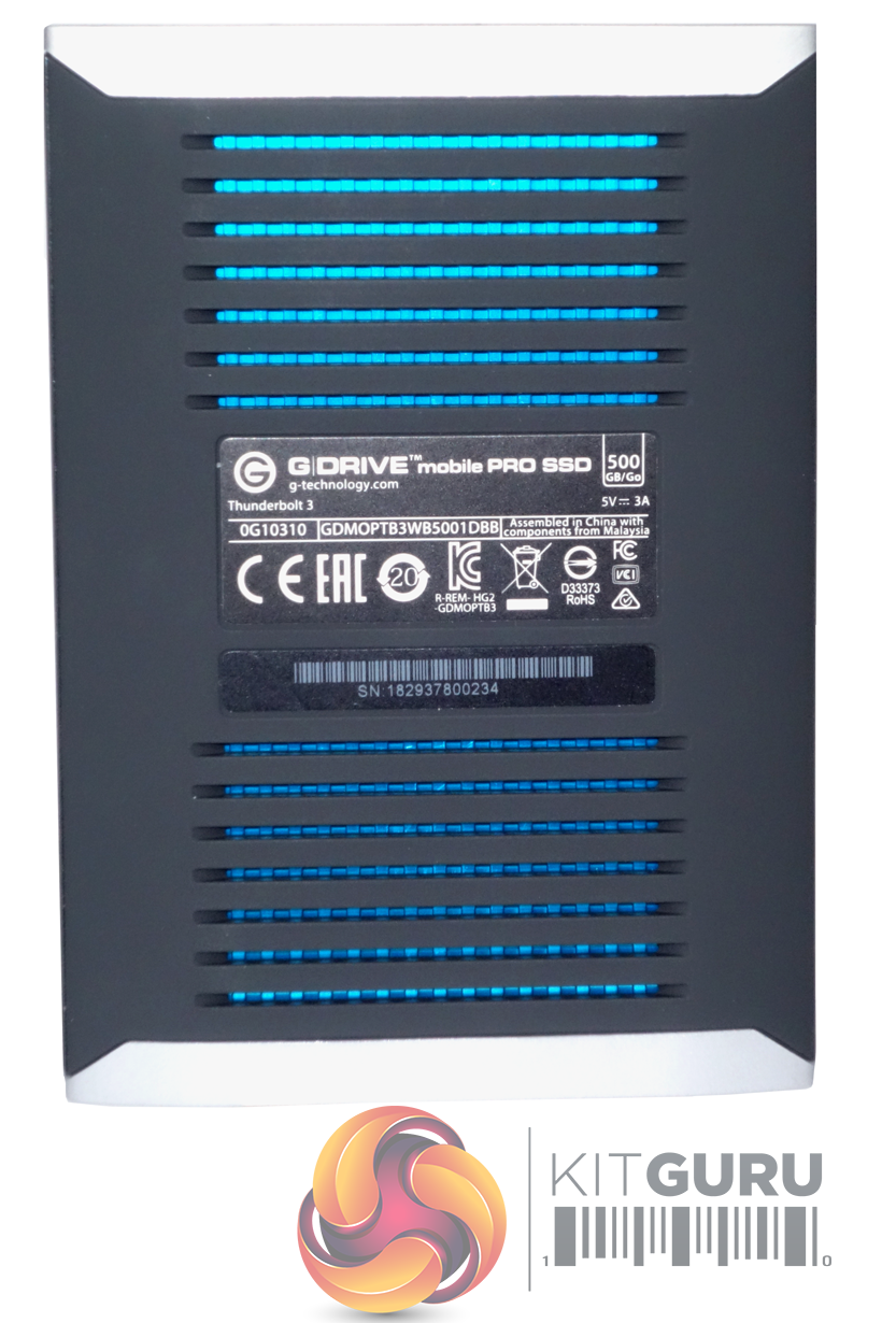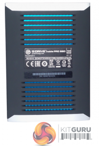 As befits a drive labelled rugged, the G-Drive mobile Pro SSD comes housed in a protective case that has a rubberised feel. The case has slots cut into it to help dissipate the heat from the large aluminium heatsink that G-technology uses to help keep the SSD cool. This works well as even when we were pushing the drive under testing, it never got more than warm to the touch.