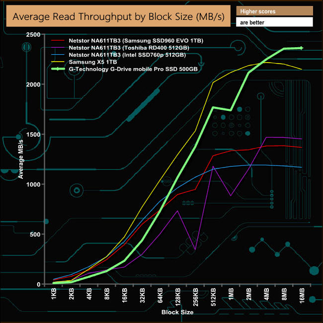 Peak read throughput performance in our testing came at the end of the test with the drive producing 2,361.75MB/s, a little shy of the top official transfer rate figure of 2,800MB/s. Even so the G-Drive mobile Pro SSD is the fastest single drive equipped external unit we've seen to date.