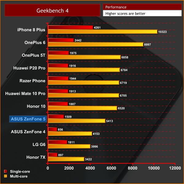 Speaking in terms of the ZenFone 5's synthetic performance, it is clearly not quite as fast as some of its rivals. The Honor 10, for instance, scores over 1000 points more in the Geekbench 4 multi-core test, despite the two phones being similarly priced.