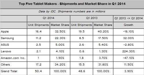 Apple sustained its lead in the worldwide tablet plus 2-in-1 market, shipping 16.4 million units, which is down from 26 million units in the previous quarter and below 19.5 million units sold in the first quarter of 2013. The reasons for such decline are general market trends, not Apple’s competitive positions since the company’s tablet lineup is more competitive than ever. Despite the reduction of shipments, the company saw its share of the market slip slightly to 32.5%, down from the previous quarter's share of 33.2%.