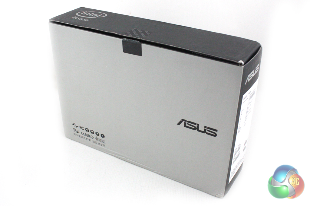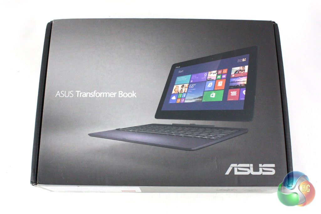 The Transformer Book T100T is supplied in a compact box, decorated in a grey livery. The top of the box features a simple design which includes a large image of the tablet.