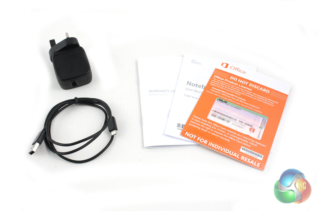 Asus include a USB cable and charger inside the box in addition to an MS Office license key, a warranty card and a concise user manual. Even though the USB cable for charging is about the same length as those supplied with most tablets, it is much shorter than a laptop charging cable.