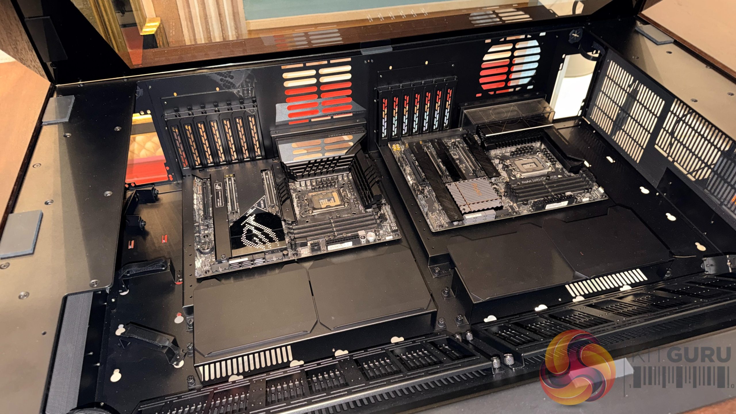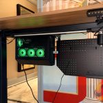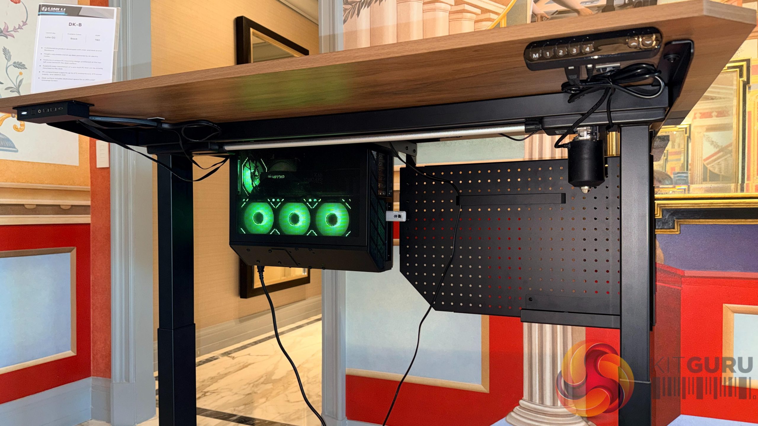 Lian Li’s desk‑style chassis also returned in updated form. The DK‑07 Wood and DK‑B models were shown with revised layouts, including sliding or retractable system compartments and integrated display elements.