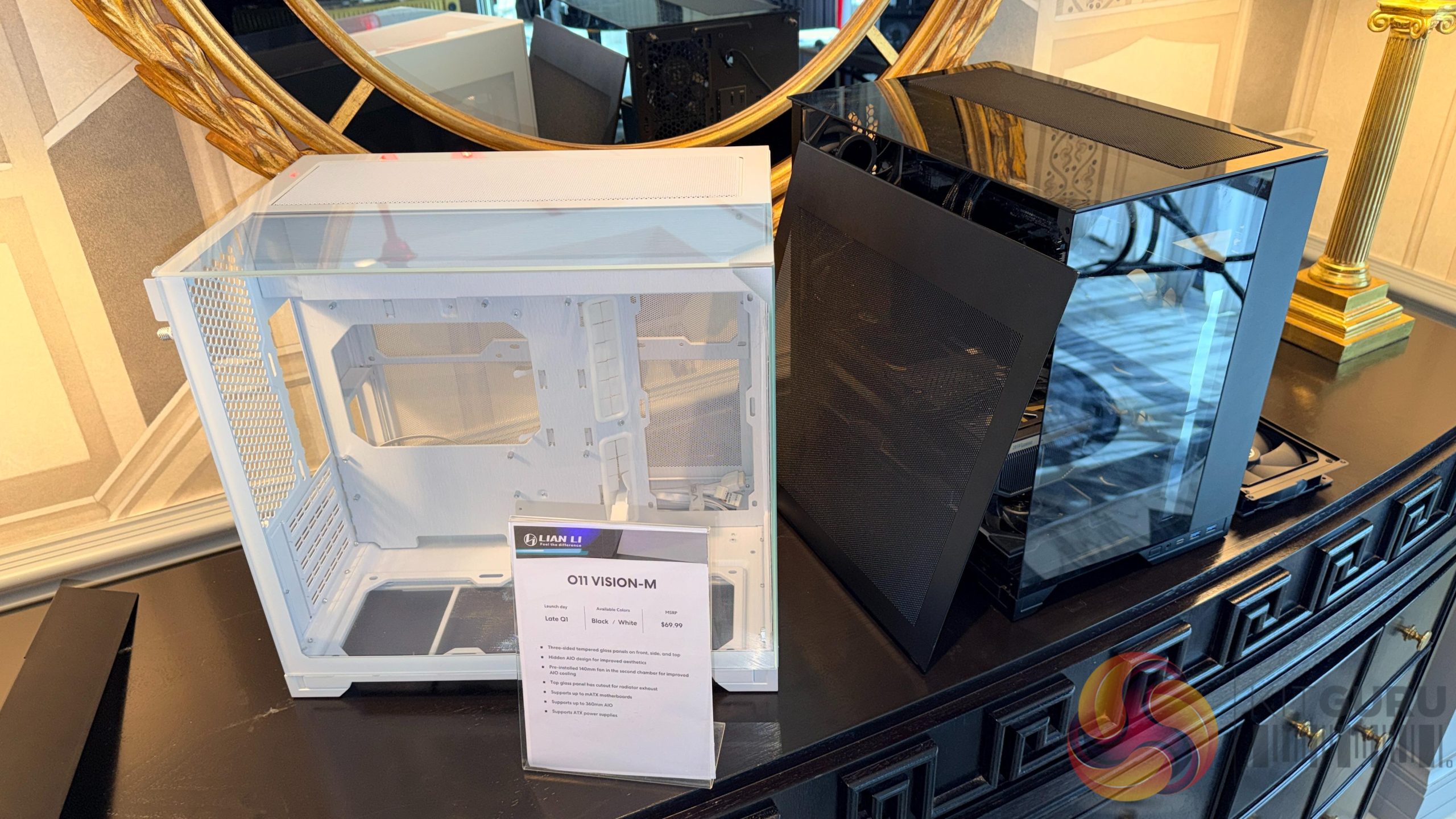 On the case side, Lian Li showcased new additions across its LANCOOL, O11 and Vector families. The LANCOOL 4, which was announced shortly before the event, appeared in its final form with the curved front panel and triple‑fan intake layout. The O11 Vision M also made a physical debut, presenting a wider internal layout and a revised chamber structure aimed at improving component clearance and airflow. Lian Li also displayed the Vector V150, a compact chassis with a hybrid mesh‑and‑glass front panel.