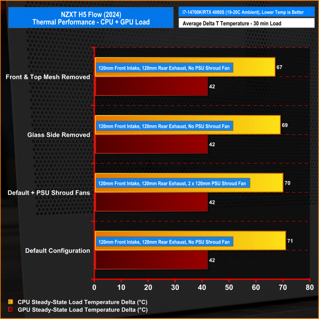 Changing the configuration from the default by removing panels had a very small effect on CPU temperature. The most noticeable CPU temperature drop is when the front and top mesh is removed as this completely removes the airflow restriction to the intake and AIO exhaust, still the CPU temperature only drops by 4°C max, so it's not a huge gain.