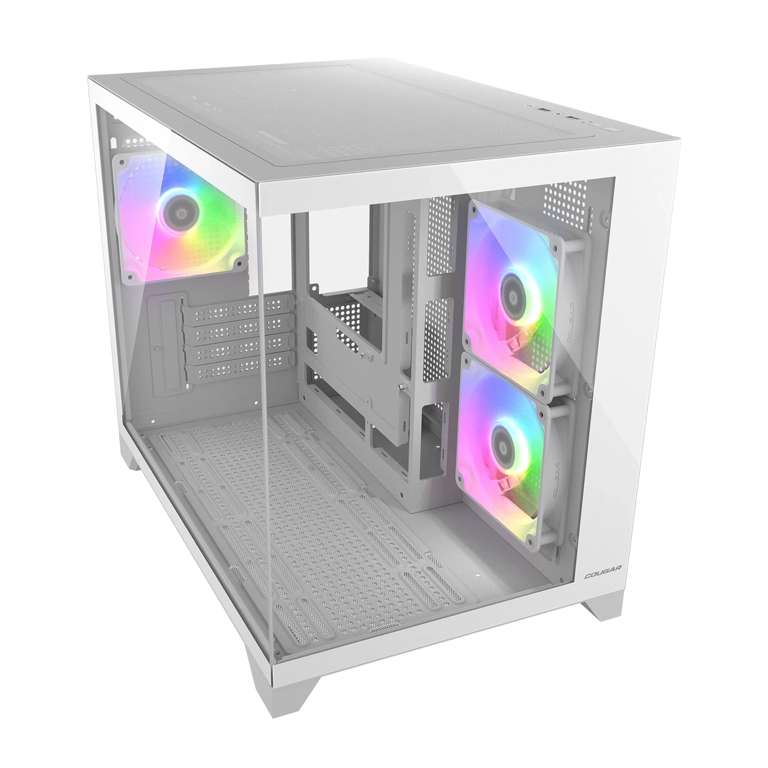 Despite its compact size, the case offers some serious cooling potential. It supports up to a 360mm radiator in the top and a 280mm radiator on the side simultaneously. To get you started, Cougar includes three ARGB fans out of the box: one standard 120mm fan for rear exhaust and two 120mm reverse-blade fans for side intake.