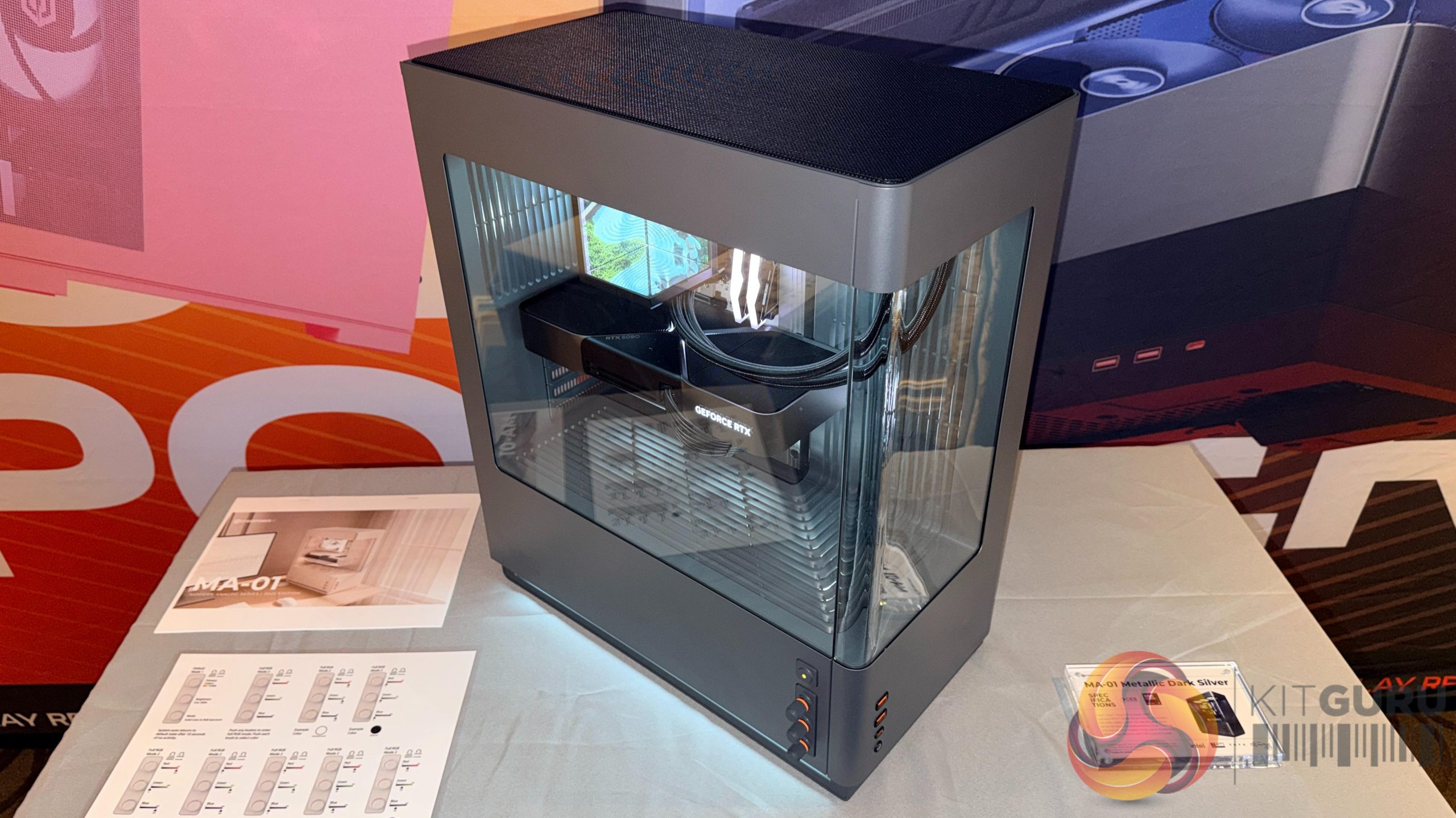 Other design elements include angled vent covers that guide intake air directly onto heat‑critical components, precision‑moulded I/O shrouds that absorb side impacts and reduce insertion wear, and support for both standard ATX and back‑connect BTF‑style motherboards. The chassis also uses two curved glass panels that meet without a corner pillar, providing an unobstructed view of the GPU, CPU cooler and memory. Analog RGB dials offer software‑free control across the full 16.7‑million‑colour spectrum, with secondary push functions for colour jumping, effect modes and brightness.