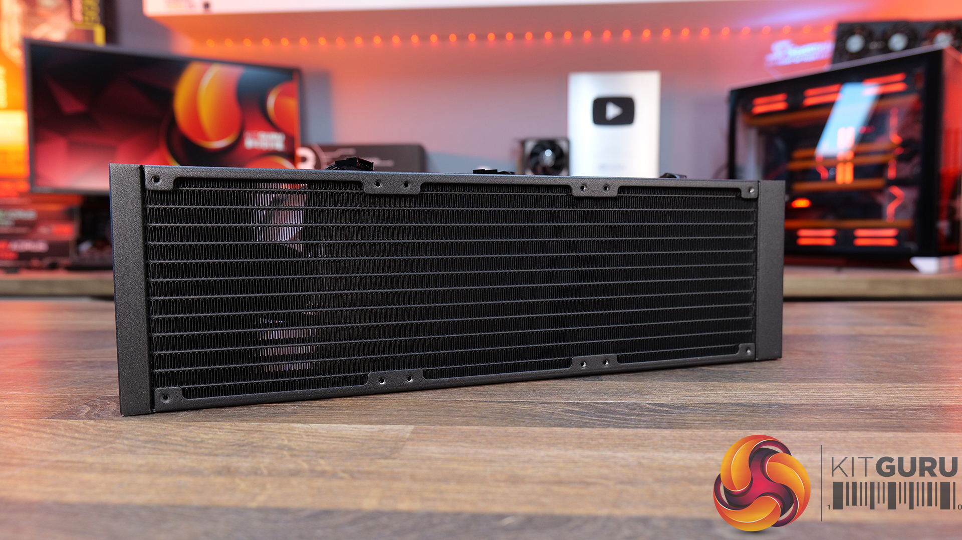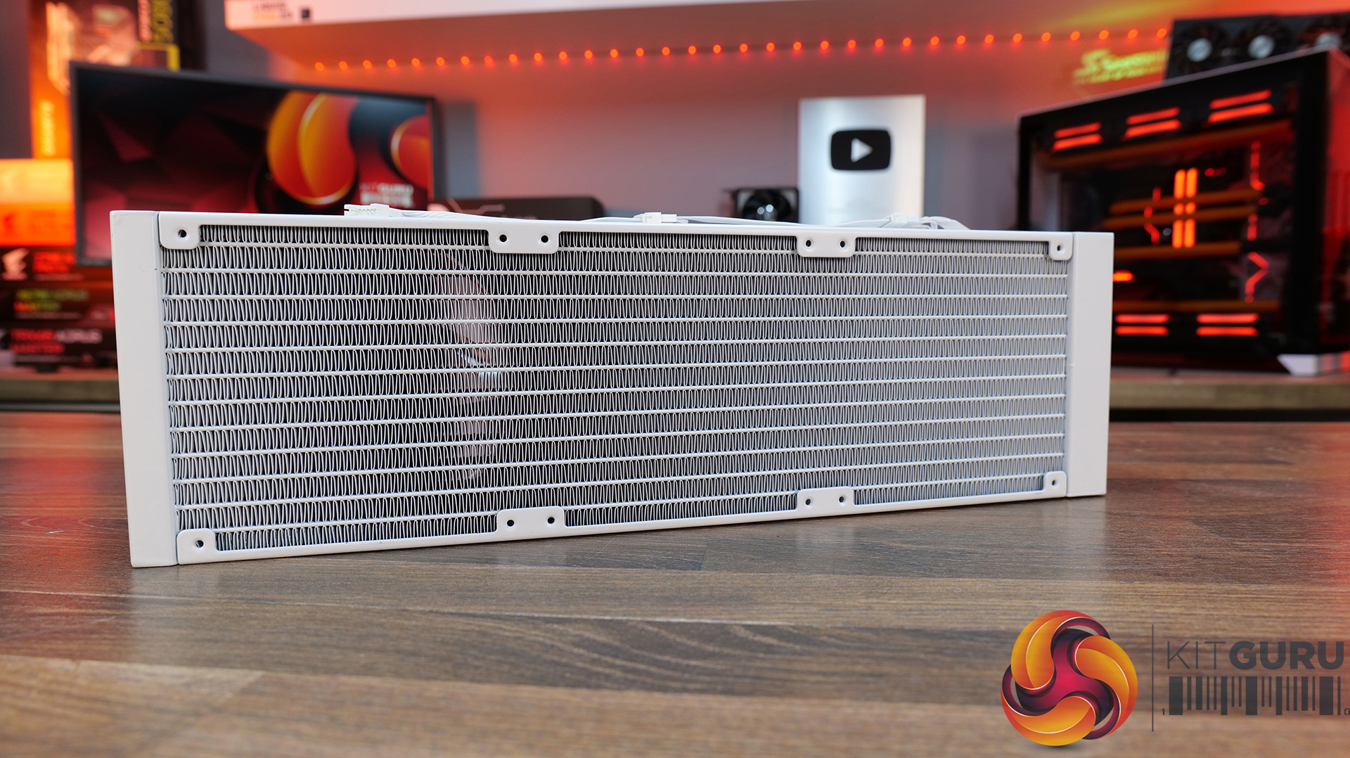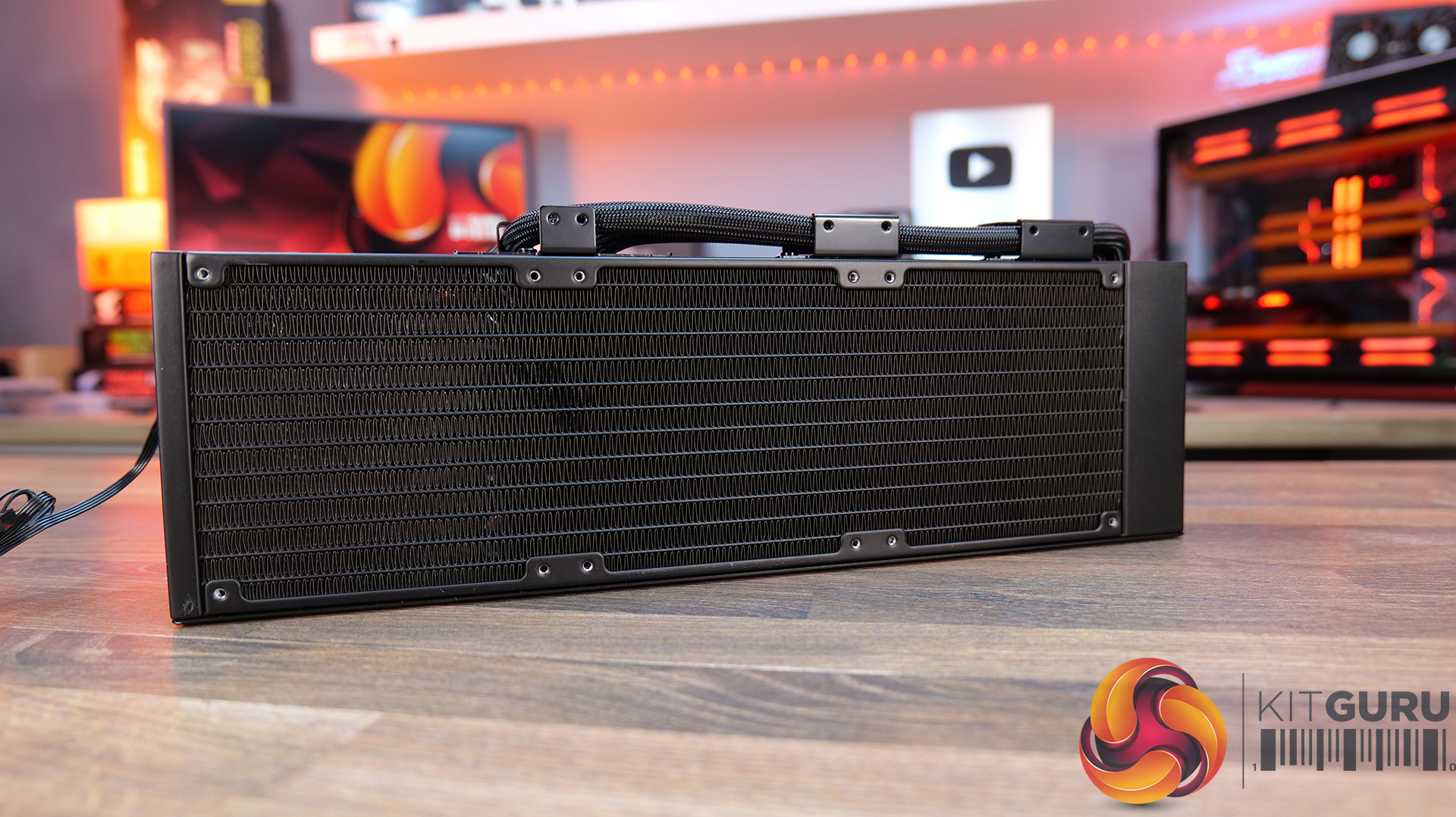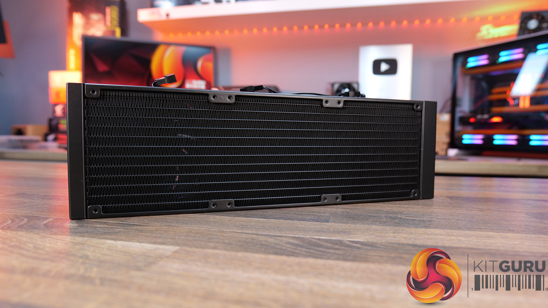 - Robust 360 mm aluminium radiator — Measuring 396 × 120 × 27 mm, with 12 waterways, and a dense fin stack to support up to 350W TDP.