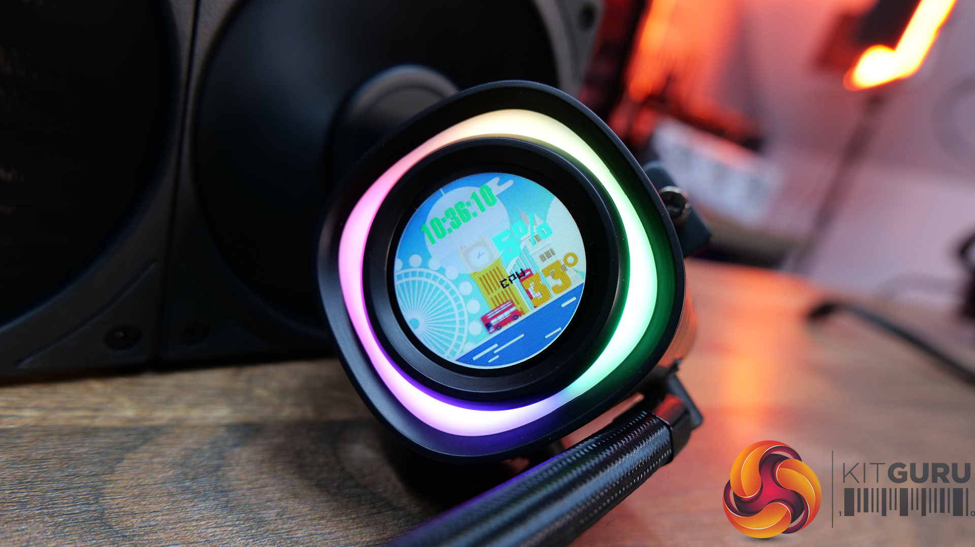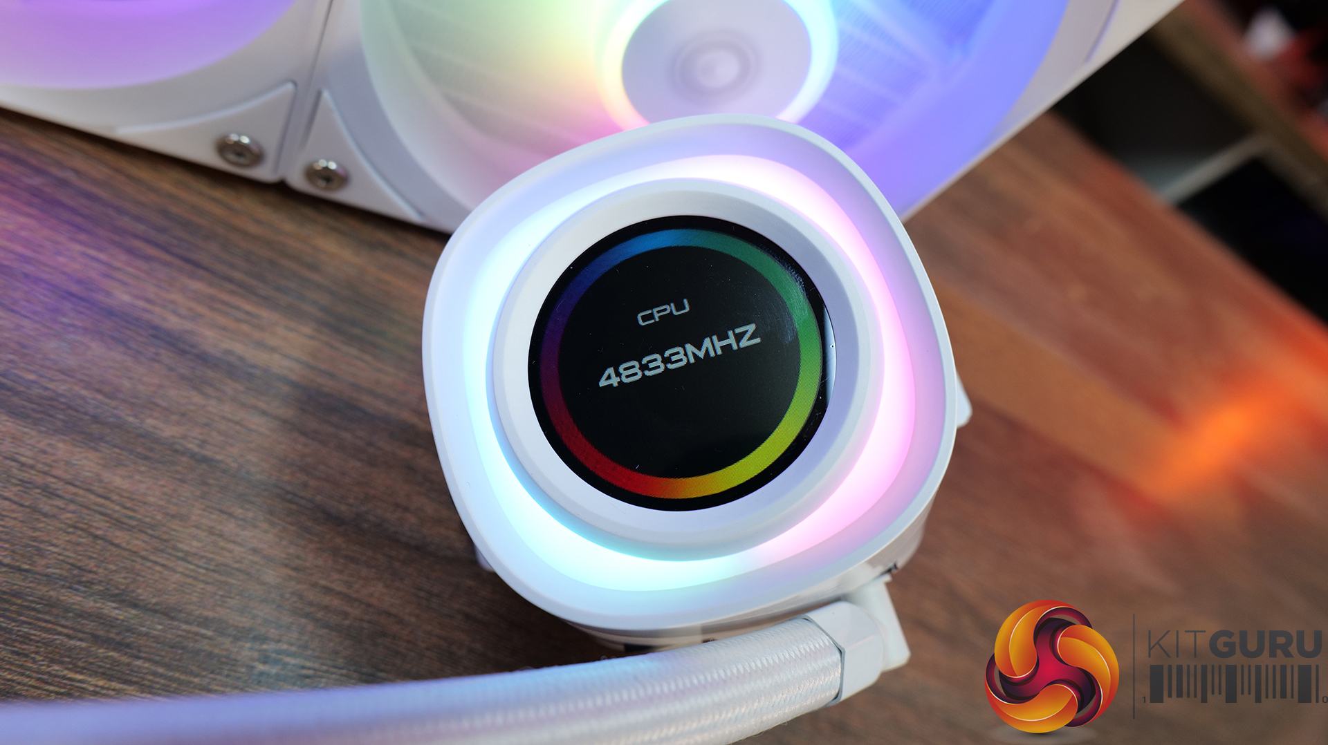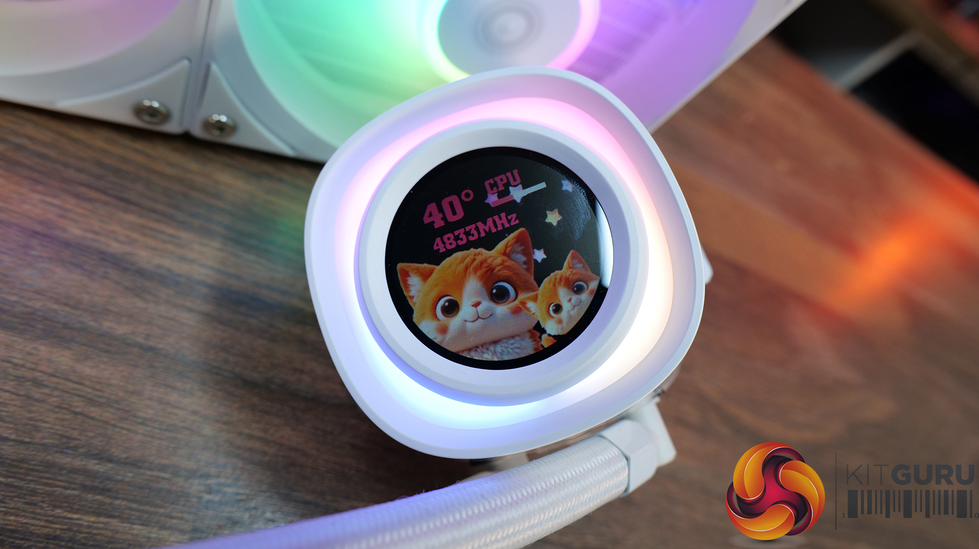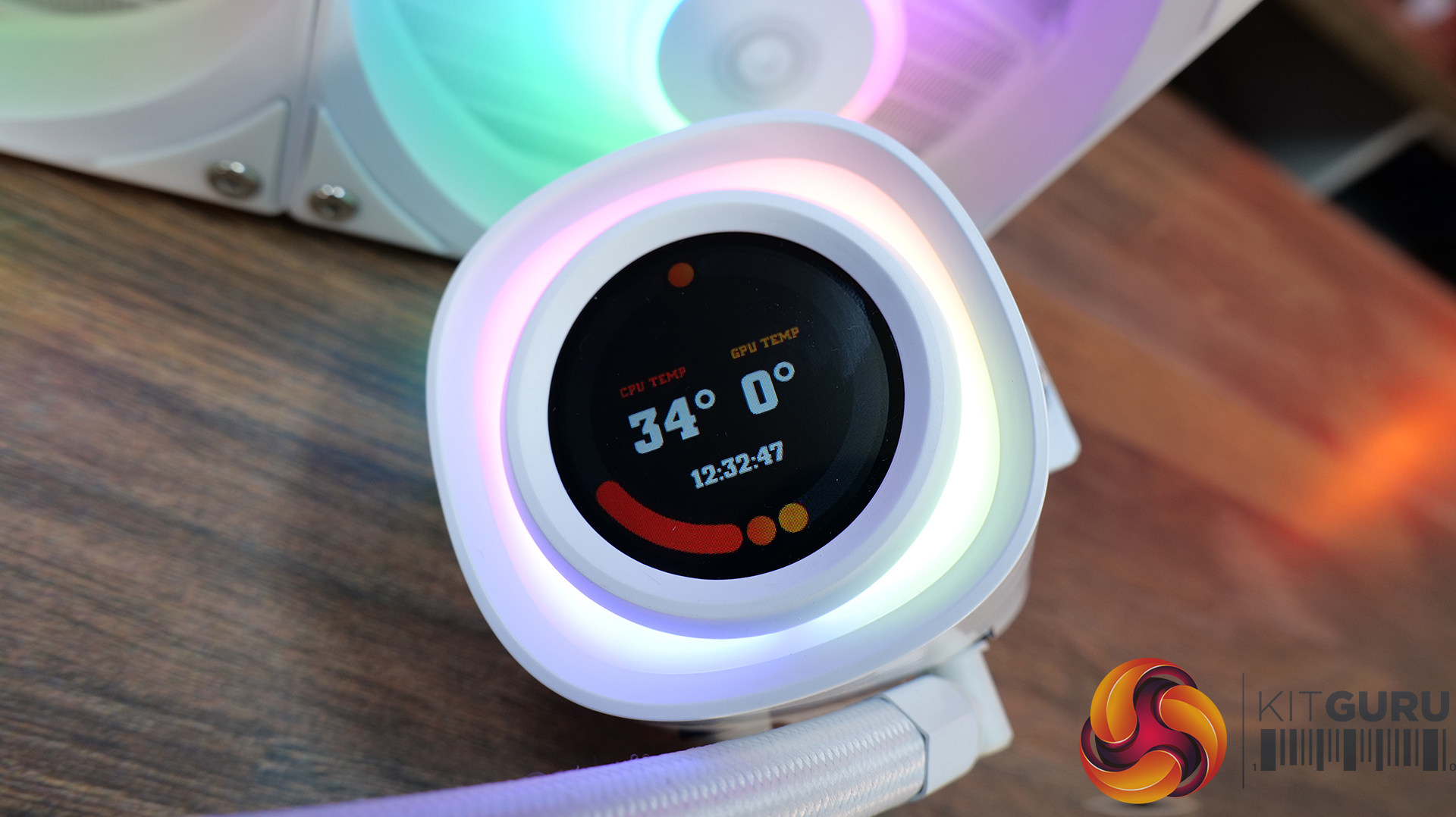 - 1.48-inch Customisable LCD Display – Pump head mounted LCD with 240 x 240 resolution, offering an 18‑bit colour depth (262K colours) and a 300 cd/m² backlight. This allows users to display real-time system information — like CPU temperature or frequency or even set custom graphics and short animations.
