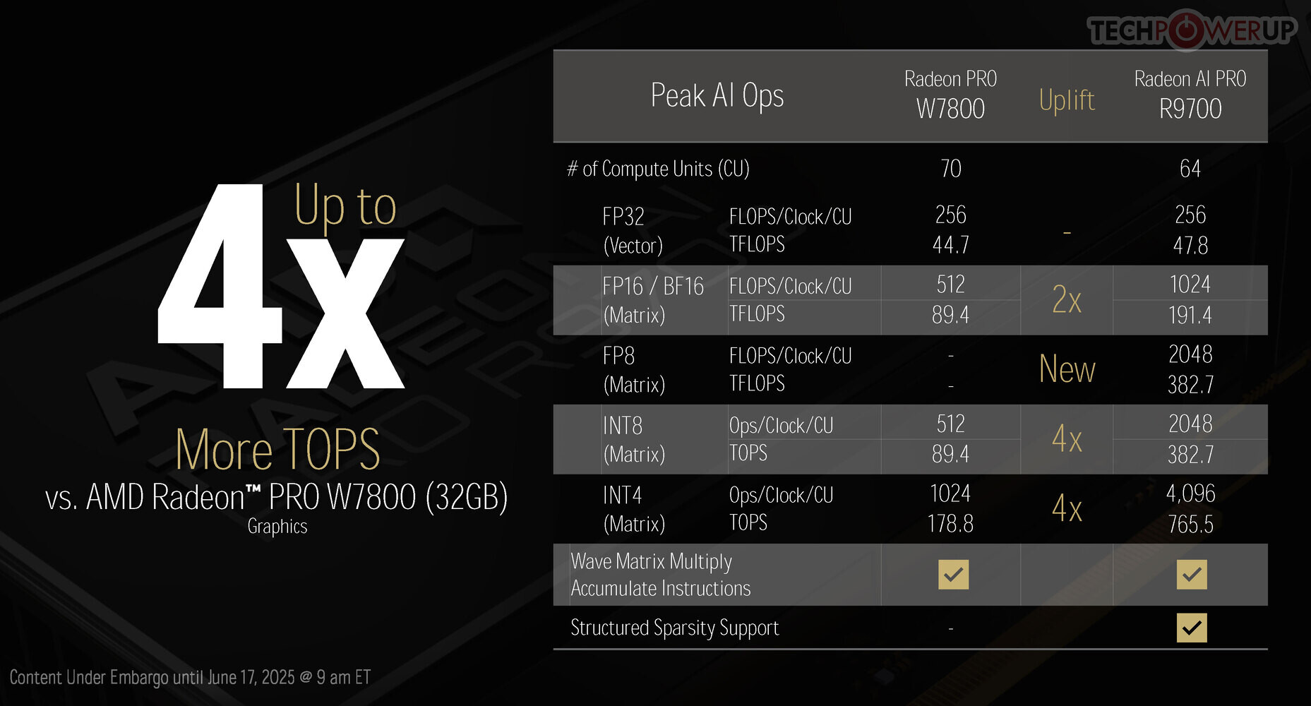 Moving on to the GPUs, the new Radeon AI Pro 9000 series represents AMD's top-tier offerings for professional visualisation and AI acceleration. These graphics cards are designed to be deployed singularly or in workstations with up to four cards installed. The flagship of this series, the Radeon AI Pro R9700, features a maxed-out 4 nm “Navi 48” GPU, boasting 64 RDNA 4 CUs that translate to 4,096 stream processors and 128 AI accelerators, and 32GB GDDR6 running at 20Gbps over a 256-bit memory bus for a maximum of 640GB/s of bandwidth, further enhanced by a 64MB 3rd Generation Infinity Cache. Overall, the AMD Radeon AI Pro R9700 delivers up to 191 TFLOPS (FP16 dense) and a 1531 TOPS (INT4 sparse) performance with a 300W TBP.