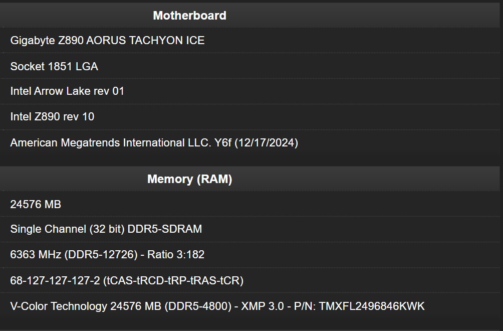 Renowned overclocker HiCookie, using the Z890 Aorus Tachyon Ice, pushed a 24 GB V-Color DDR5 memory module to a staggering 12,726 MT/s (6,363 MHz). This feat was achieved with timings of 68-127-127-127-2T, and a Core Ultra 9 285K CPU downclocked to 419 MHz with only two cores enabled. Liquid nitrogen was used to cool the memory.